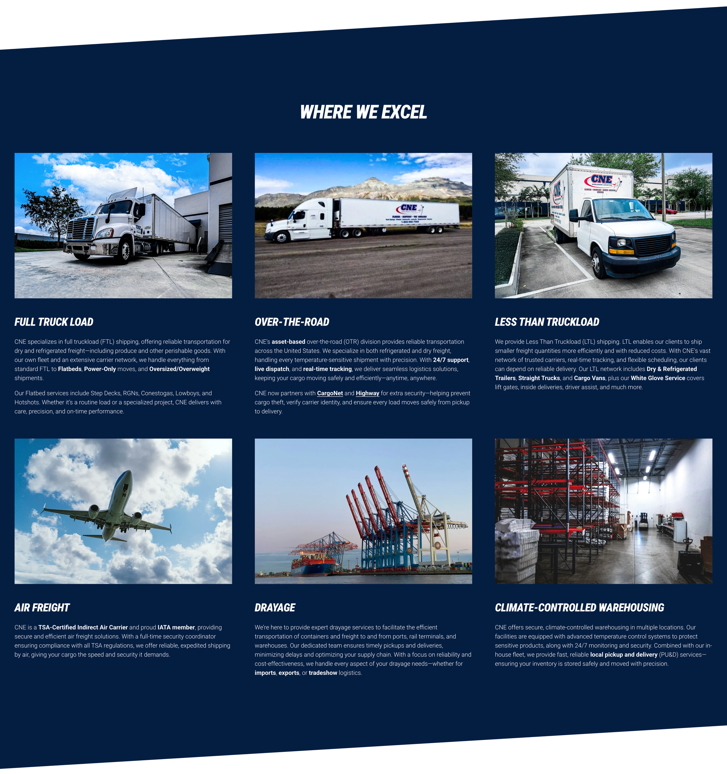 A third-party logistics company needs an online presence that delivers as well as they do. This website layout keeps CNE’s job simple while giving customers the info they need to start shipping.
